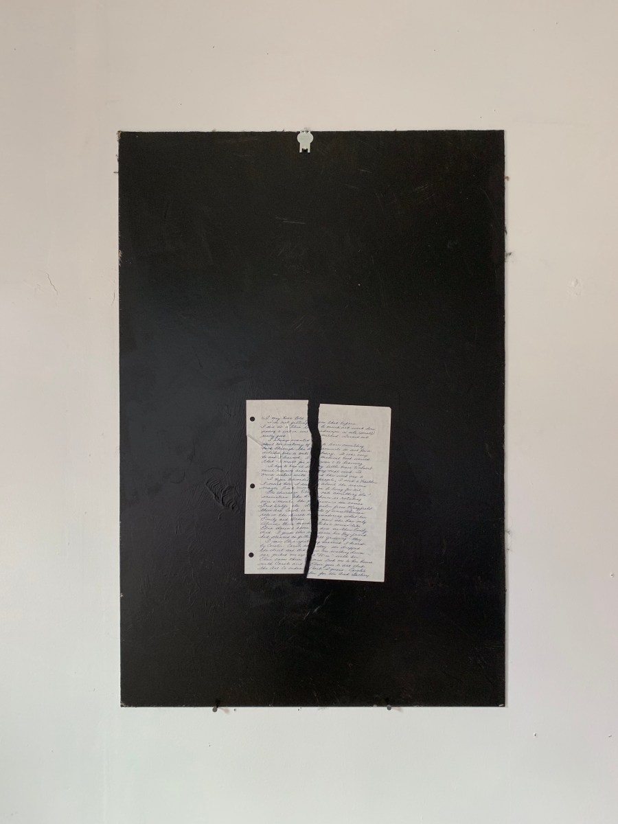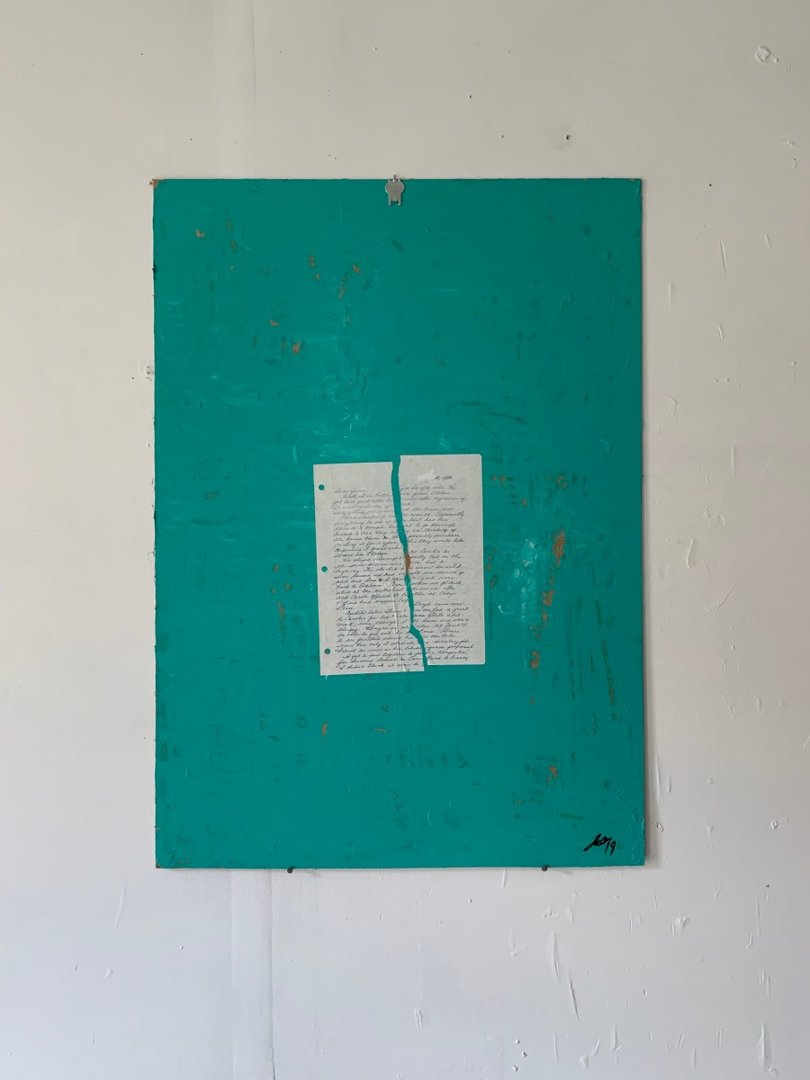 It’s been a busy summer, at work and in my studio. I recently completed a new series based on old letters from my Mom, collaged onto pieces of wood given to me by my Dad. The art feels expressive and biographical, and really came from a place of self-reflection. When you are up close to the piece, you can see that most of the letters date back to 1996, the year I officially left home. My Mother was processing her new life without her son around, and these pieces commemorate that moment.