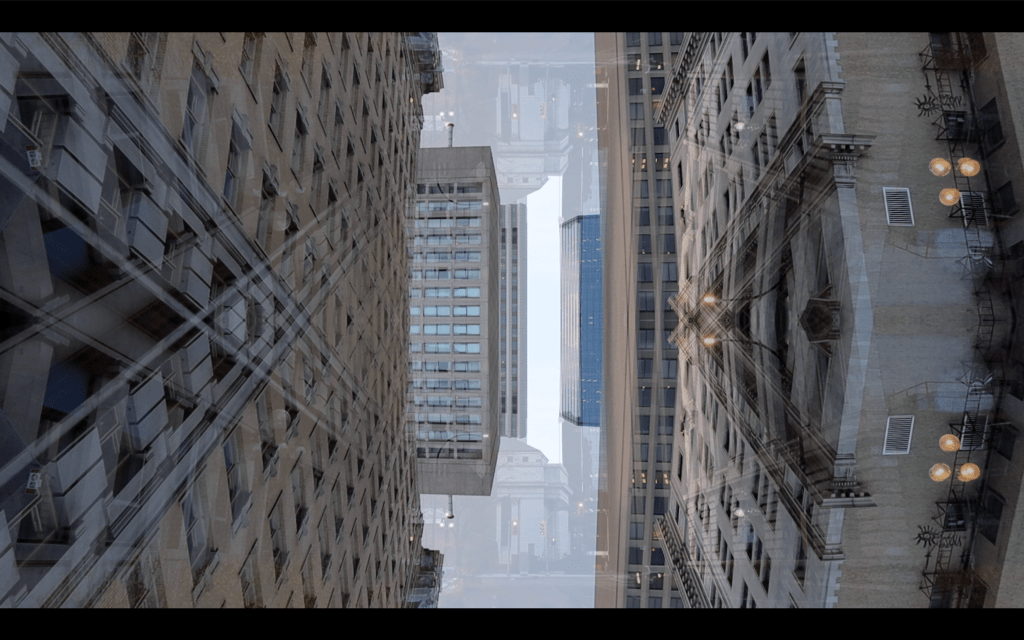 Yellow, cyan and magenta wash over the digital flow to create the idea of a film negative, windows become the perforations, and the vertical movement indicates film threaded through the light of a projector. Low hum vibrations echo the sounds of the mechanical device.